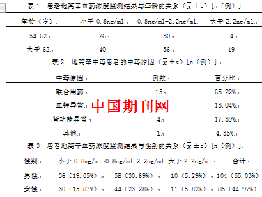 根据表1-3可知,在189例次的地高辛血药浓度监测中,有100例次血药浓度测定值在治疗浓度0.8-2.2ng/ml内,占总例次的52.91%,有66例次血药浓度测定值低于治疗浓度范围下限,即小于0.8ng/ml,占总例次的34.92%,有23例次血药浓度测定值高于治疗浓度范围上限,即大于2.2ng/ml,占总例次的12.17%,研究显示,性别对于地高辛血药浓度监测结果的影响不明显(p>0.05)。随着患者年龄的增大,地高辛血药浓度呈上升趋势。